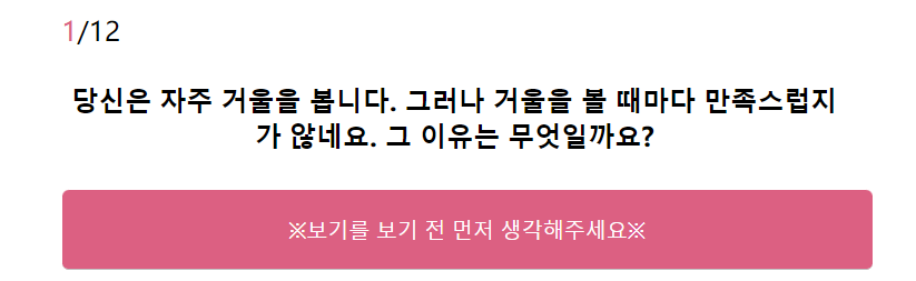 모든 문제를 푸실 때는 문제가 나오고 "보기를 보기 전에 먼저 생각을 해주세요"라는 문구가 나옵니다. 이 부분을 클릭해주시면 본 문제에 대한 보기가 주어진다는 점 참고하셔서 풀어주시면 됩니다. 제대로 해보고 싶으시다면 먼저 질문만 보고 여러분들의 상상력을 발휘해서 답을 떠올려보시는 것도 도움이 되실 것 같습니다.